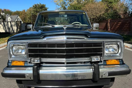 THIS… is a 1989 Jeep Grand Wagoneer, finished in Dark Blue with a tan interior.