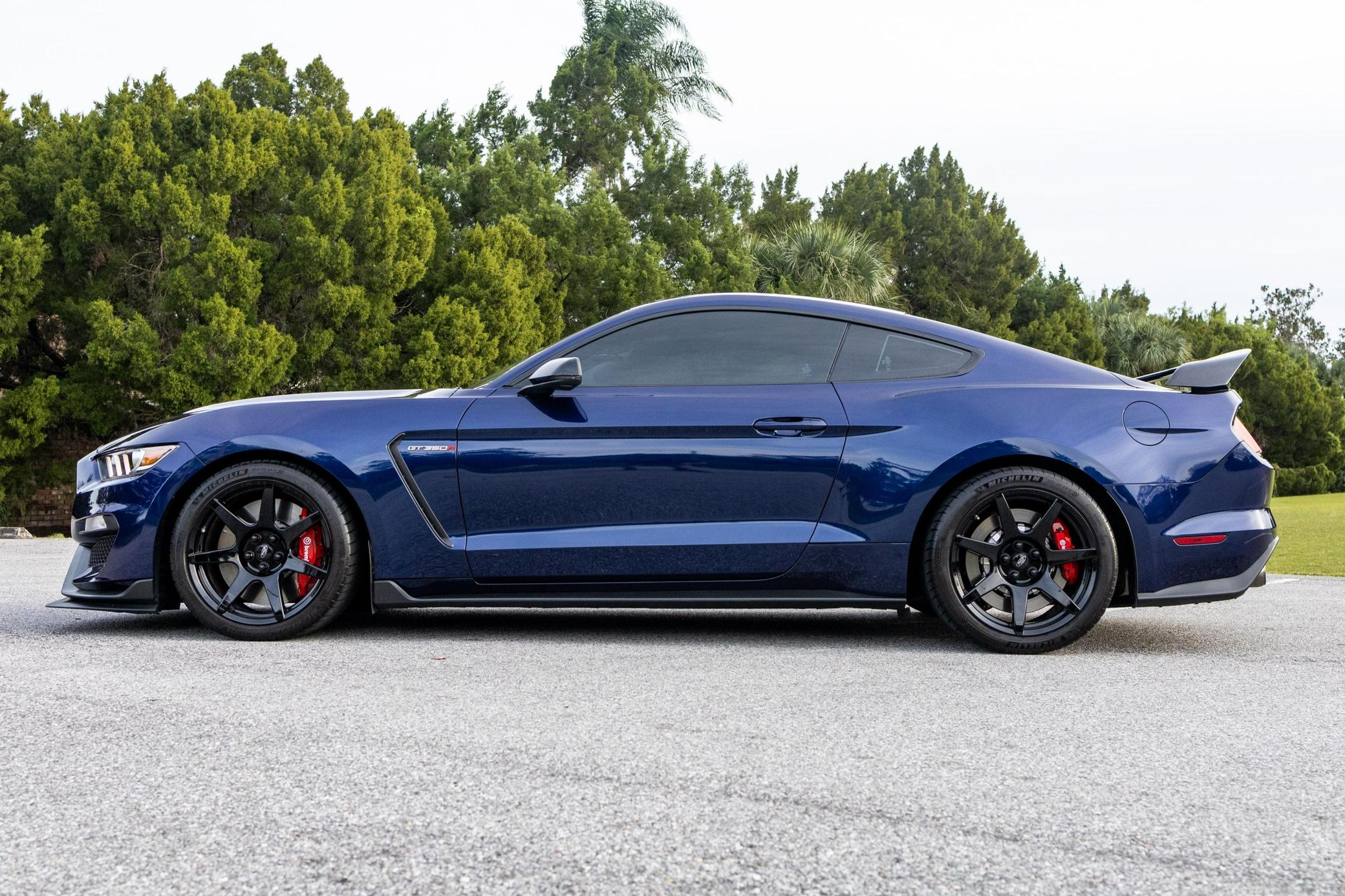 THIS… is a 2020 Ford Mustang Shelby GT350R, finished in Kona Blue Metallic with a Ebony and red interior.